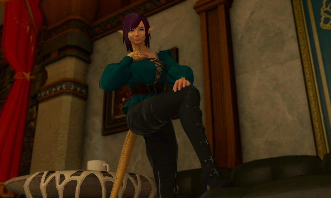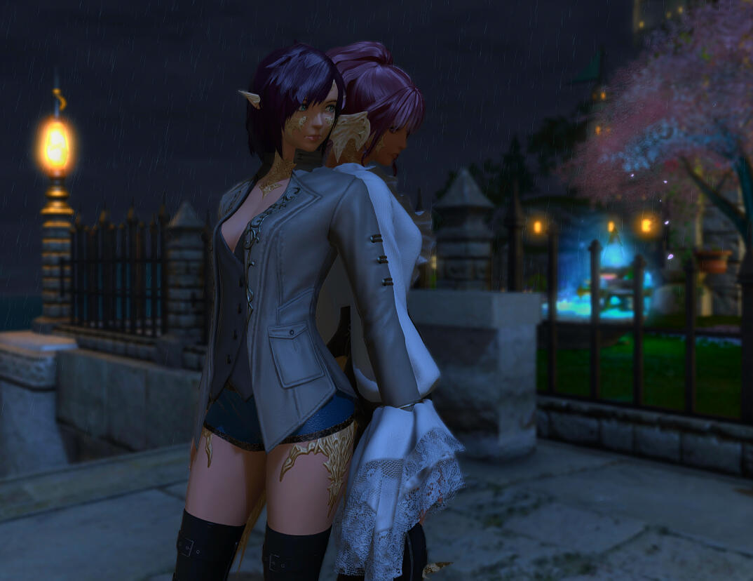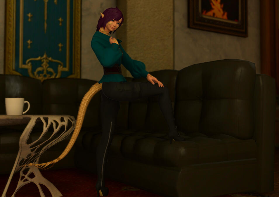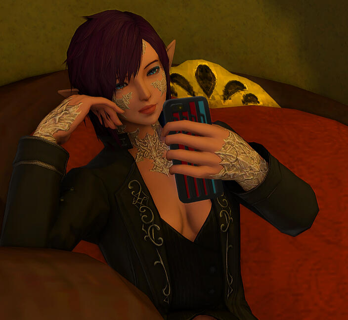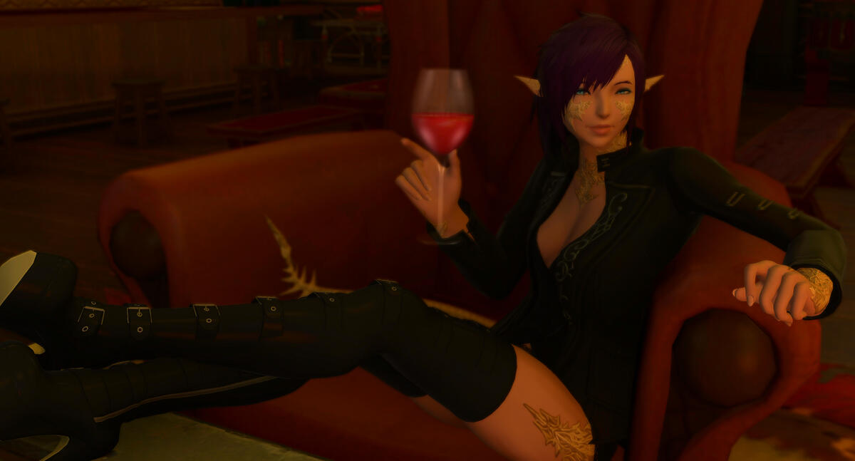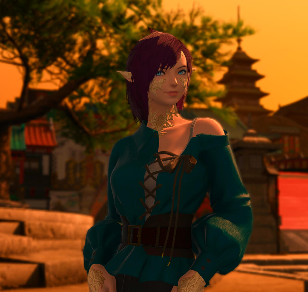Growing up in a small port town in Othard, a rural trade hub with her twin sister Niyuki and their mother. Born from the forbidden love of their elezen father and au ra mother, Niyuki and Murasaki share resemblence to both. Some time into their toddler years, Yakuza showed to their home, and despite efforts of hiding; Niyuki's cries of terror/stupidity led her to being caught and kidnapped by the Yakuza. Fearing for her twin's safety, Murasaki begged for her mother to act, but nothing was done, leading Mura to resent her mother due to lack of action.Murasaki's mother eventually suffered emotionally due to the loss of one of her daughters and sunk into a deep depression alongside her remaining daughter's resentment. When Murasaki was older and saved up enough money to charter a ship, she left home and her useless mother to seek out and find her lost twin.Through the course of finding her lost twin, Murasaki learned the art of manipulation, deception, and at times using her own body to extort information out of those in a state of post relaxation. To this day, she uses these techniques in her work. There is also, more than likely a dagger tucked somewhere on her clothing.
